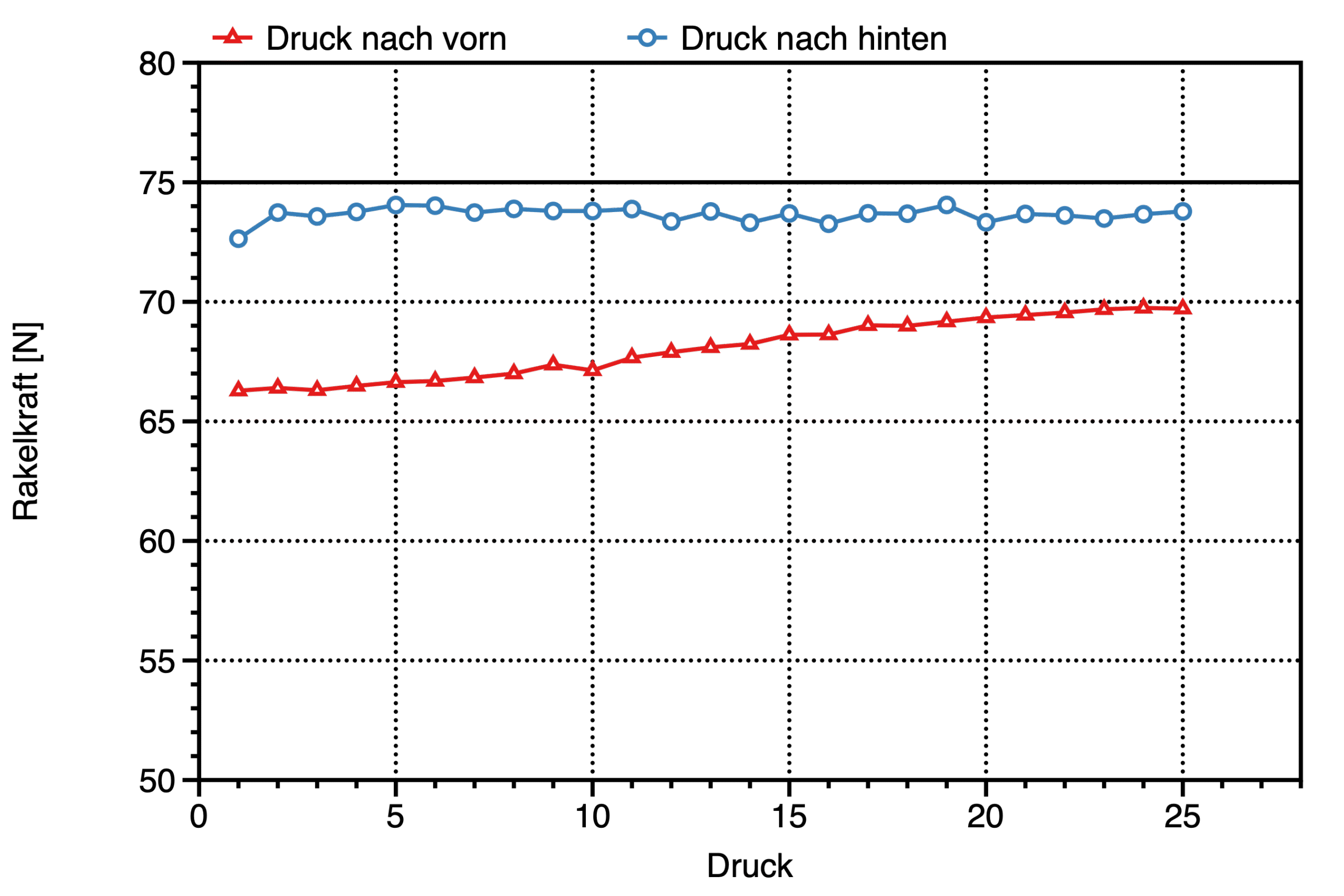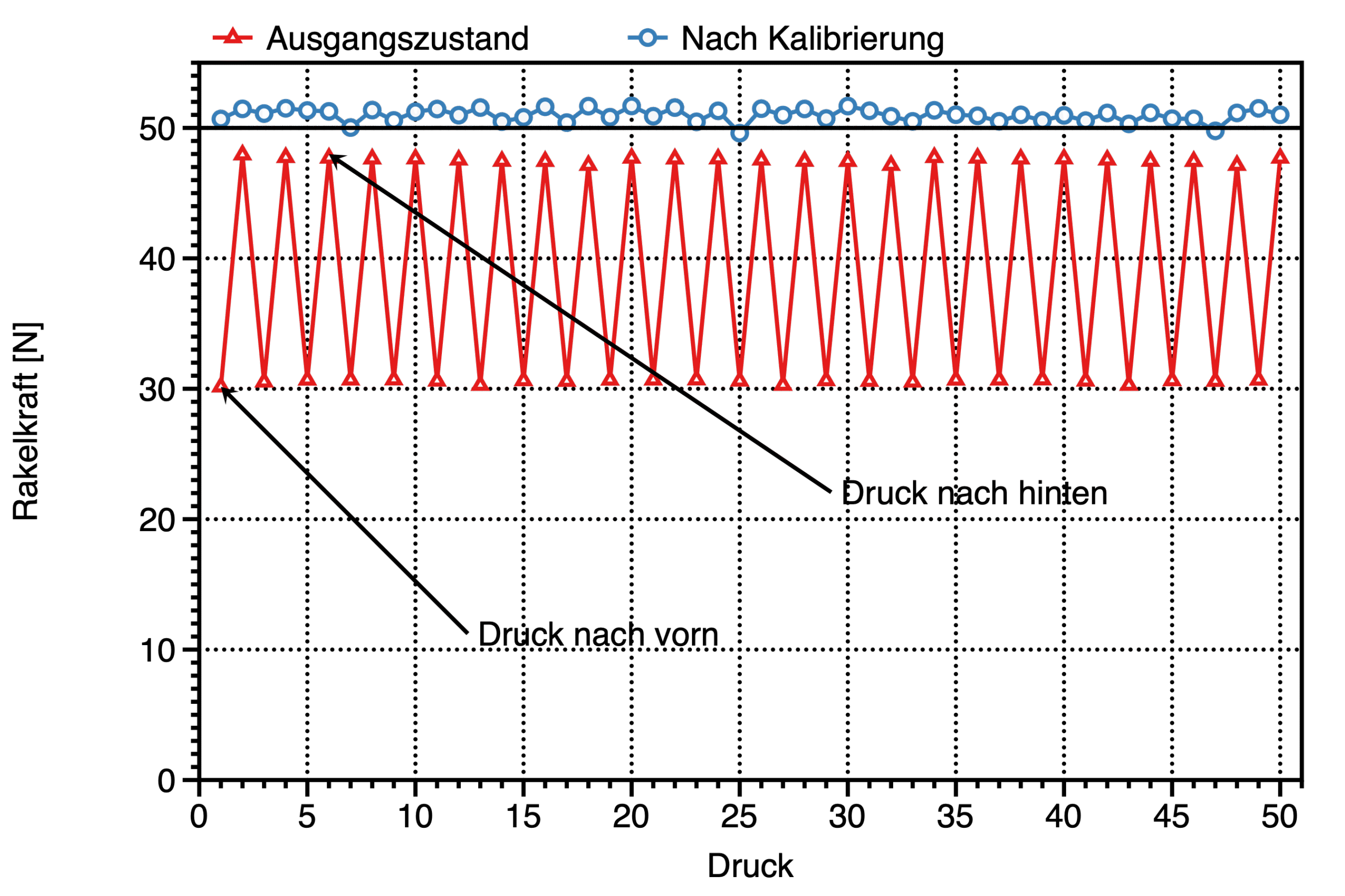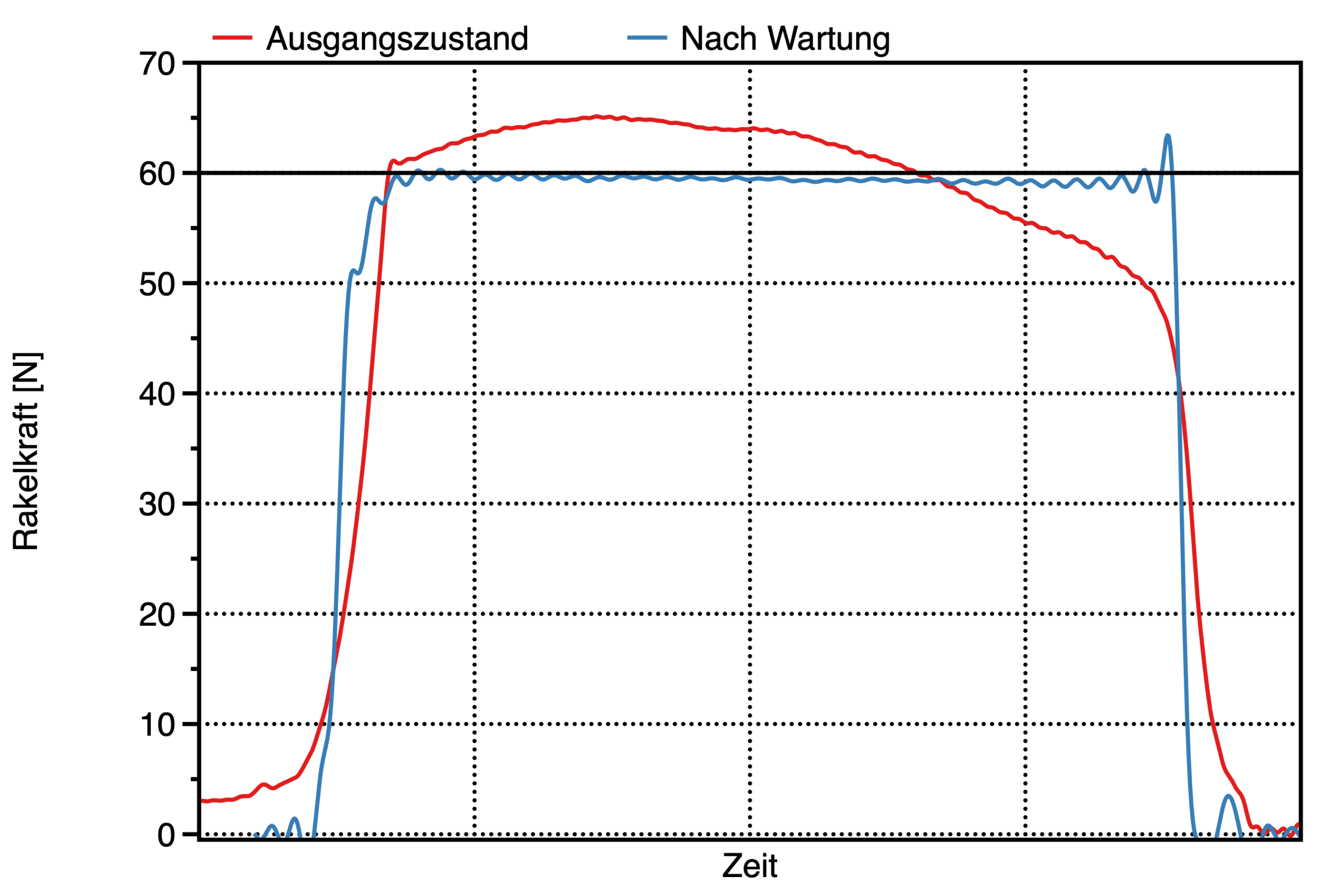 This chart shows the change in squeegee force over time as the squeegee moves from front to back (Front). The goal is to identify deviations from the target force, which may indicate mechanical influences, wear, or inconsistent force settings.